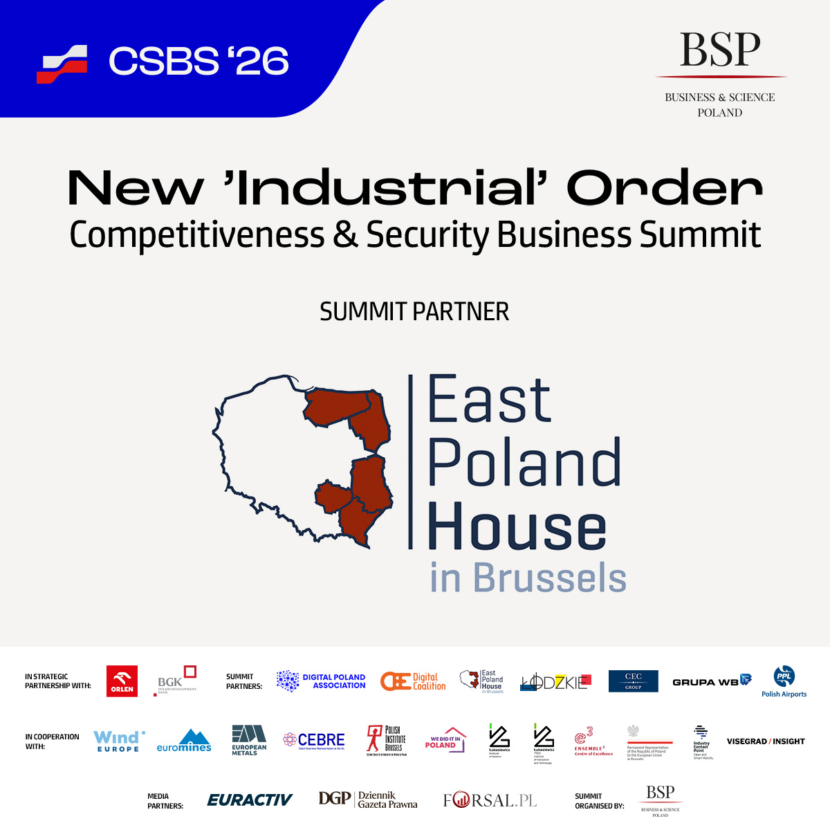 Konferencja „New ‘Industrial’ Order – Competitiveness & Security Business Summit (CSBS’26)” odbyła się 18 marca 2026 r. w Brukseli. Organizatorem wydarzenia było Business & Science Poland, a partnerem szczytu był Dom Polski Wschodniej / East Poland House w Brukseli, który wspiera promocję potencjału gospodarczego i innowacyjnego regionów Polski Wschodniej na forum europejskim.